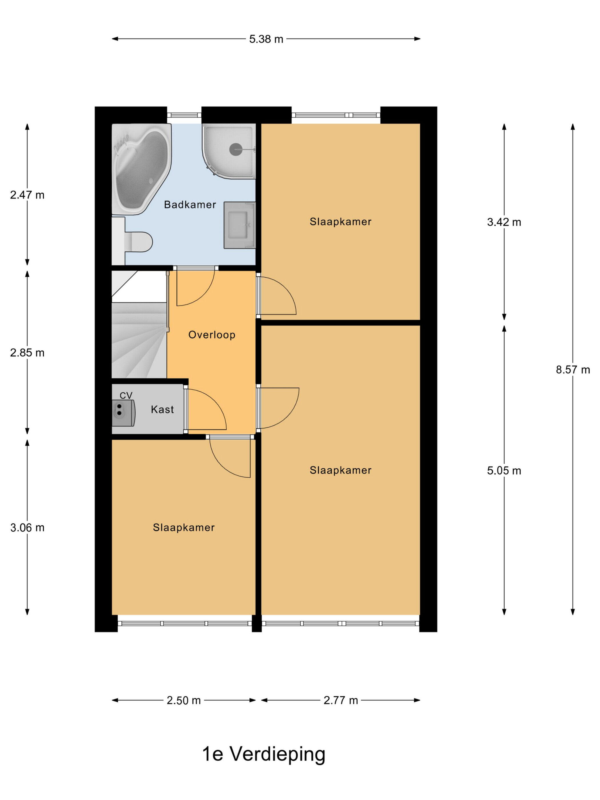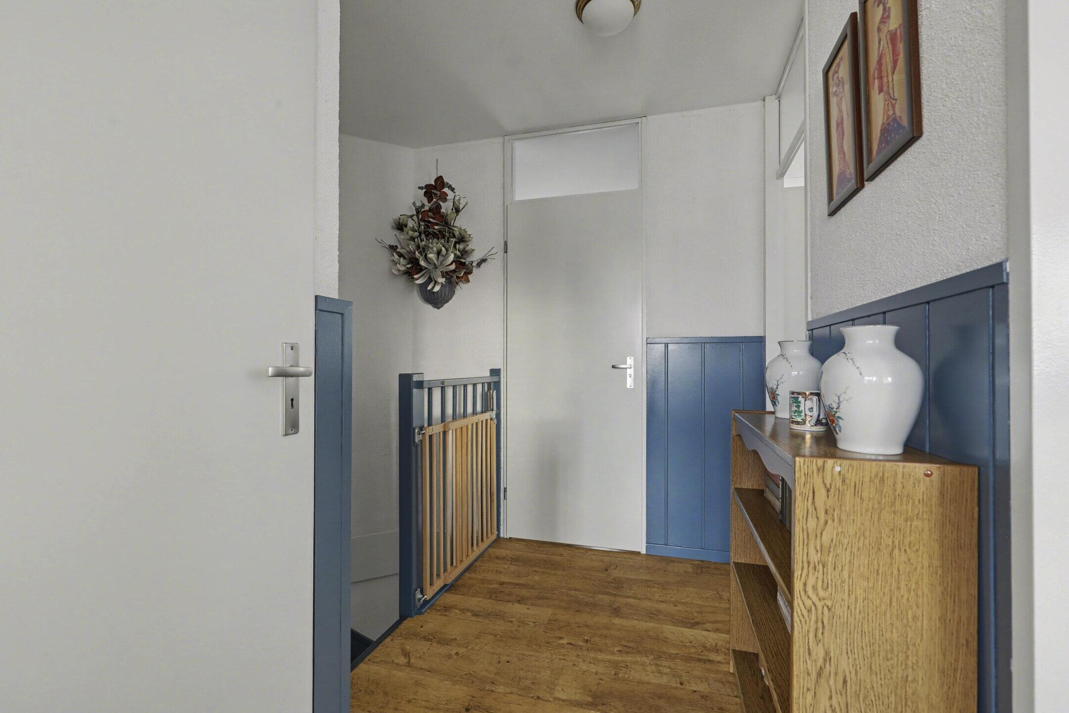 Eerste verdieping: ruime overloop met kast waarin de cv ketel (2017) is ondergebracht. Heerlijke badkamer met inloopdouche, ligbad, tweede toilet en een wastafelmeubel.
