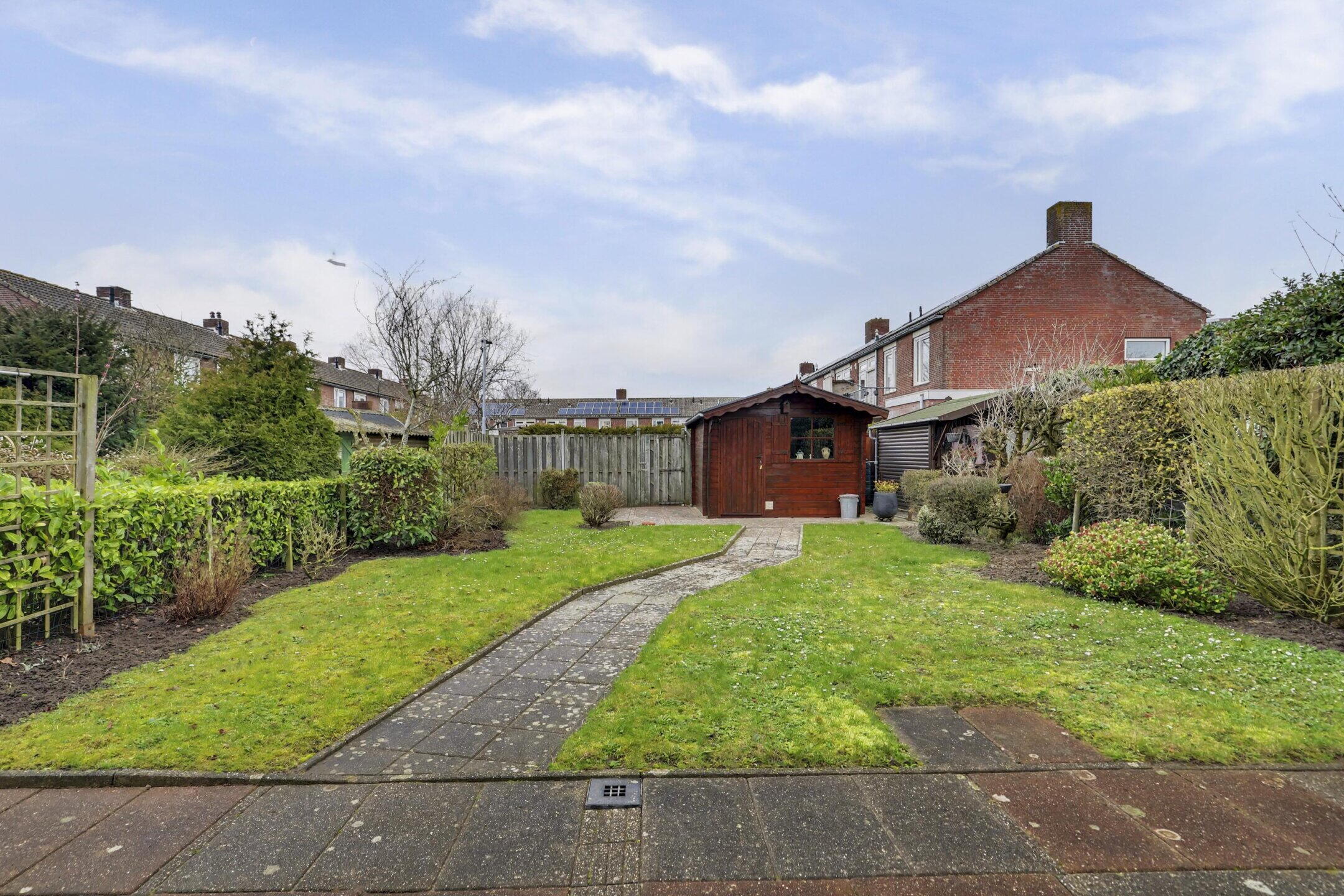 De kavel biedt een achtertuin van 14 meter diep met ruime, blokhut en een vrije achterom via de brandgang De binnendoor bereikbare garage is 6,30 meter lang en heeft een elektrisch bedienbare sectionaaldeur met een praktische loopdeur. Aan de voorkant is een oprit zodat ook daar de auto van de straat af geplaatst kan worden. De voortuin geeft een vriendelijke afstand naar de straat.