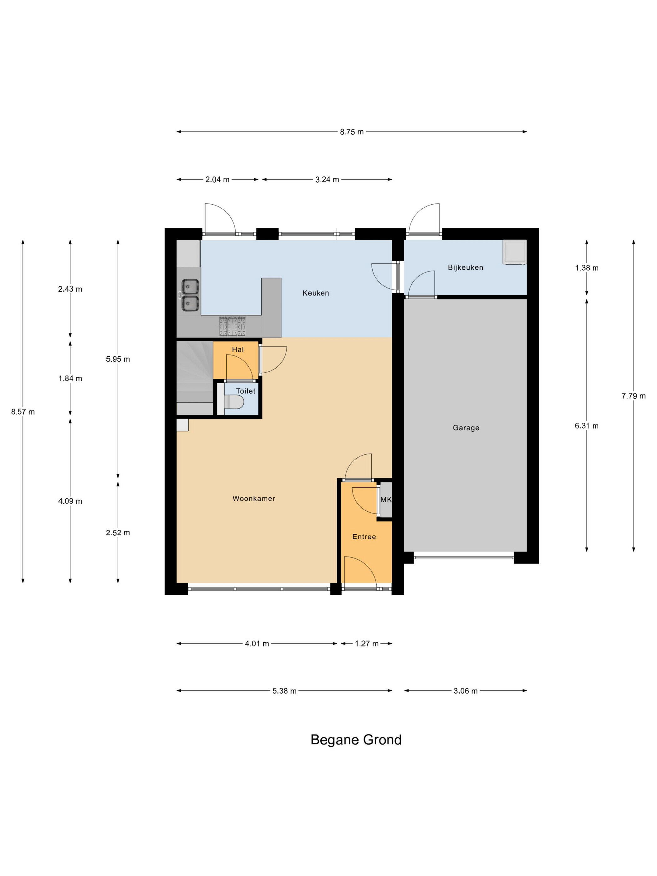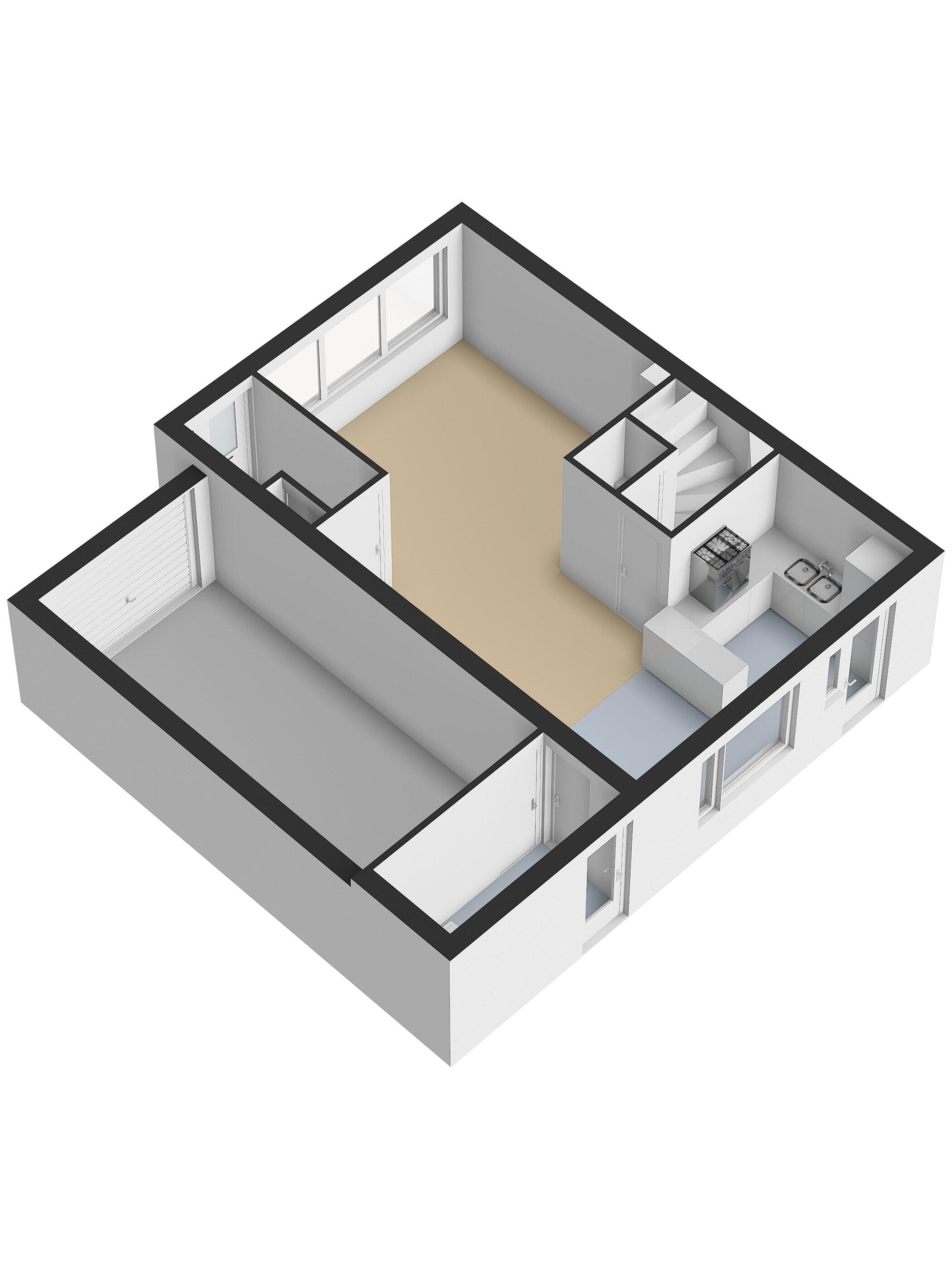 Begane grond: portaal met moderne meterkast. Woonkamer van bijna 30 m2. De keuken is open, is uitgevoerd met een functionele keuken uitgevoerd met inbouwapparatuur en gekoppeld aan een praktische bijkeuken die geschikt is voor het plaatsen van witgoed en ook binnendoor toegang geeft naar de garage en de tuin. Halletje naar de trap met toegang naar het toilet.